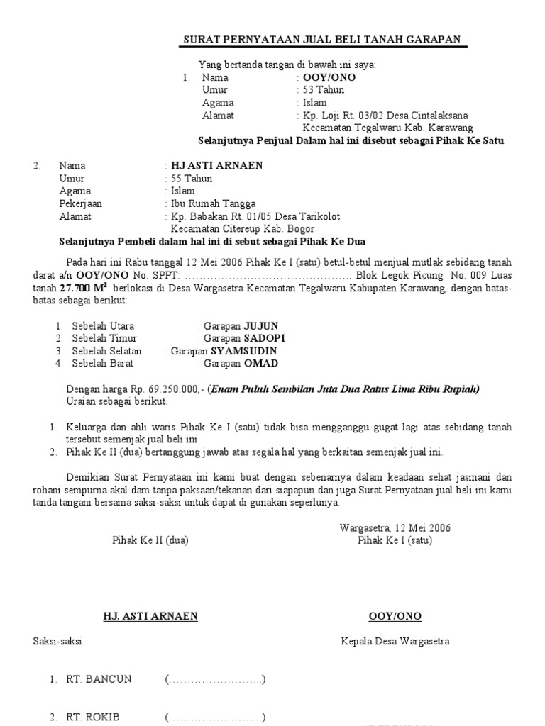 Kedua, sah secara hukum jual beli di negara republi. Ya, hal ini dilakukan demi kelancaran transaksi supaya dijauhkan. Surat jual beli tanah adalah surat yang dibuat dalam kesepekatan bersama antara pihak penjual dengan pembeli tanah, yang mana isinya memuat surat ini dibutuhkan tanda tangan kedua belah pihak diatas materai yang cuku guna melegalkan surat jual beli tanah. Documents similar to contoh surat jual beli tanah. Dalam artikel ini contoh surat penjualan dan.